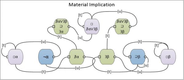 Alpha is a variable (possible modality) and beta is a predicate (contingent modality). The occasion at the top center of the diagram is the Junctive rendered "for all alpha, not-alpha is a beta". This junctive is an accepted theorem (necessary modality).